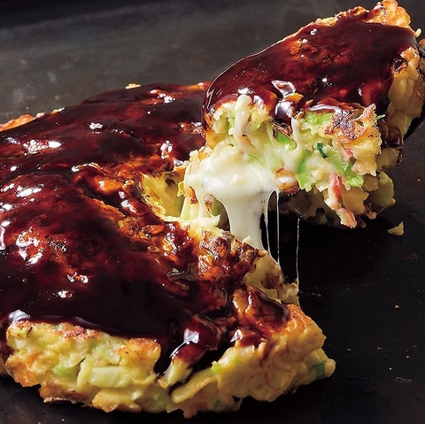 女性をターゲットにしたメニューのチーズまみれ豚玉、メガチーズ玉、は見た目も華やかでインパクトのあるお好み焼きです!大阪に負けない東京発のお好み焼きをオリジナルの味付けでご提供しています♪