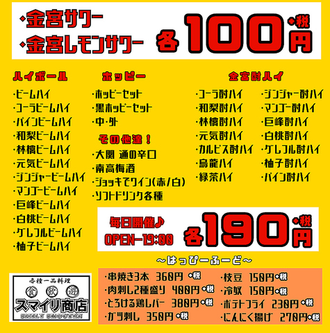駅近を感じさせない下町のような雰囲気を放つ店内は、昭和の世界にタイムスリップした気分♪終電まであとちょっとだけ!ってときにも便利♪暑いときはグイっとビールとハイボールで体を冷やしに、寒いときはお鍋やおでんで体をあっために避難・・・スマイリ商店はいつでもアナタの受け入れ準備万端★【本厚木/飲み放題/居酒屋/焼き鳥/食べ放題】