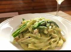 グリーンアスパラのピュレと自家製のパンチェッタで作ったクリームソース道産小麦のもっちりとした生パスタによく絡みます。食べた瞬間からアスパラの味と香りが口いっぱいに広がります。