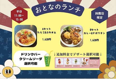 オムライス&パスタが楽しめる新しいランチメニュー2種類が登場(!)多くのお客様から要望を頂いた、オムライスとパスタとサラダが楽しめるランチプレートドリンクバーorクリームソーダ付き追加料金でデザートも追加できます。大変お得に感じるプレートとなっておりますので、是非ご賞味くださいませ