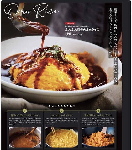 ケチャップライス/創業46年。店内仕込みのこだわりとベースの味は守りつつ、進化を続けることで、愛される一品に。/【美味しさのこだわり】[1:濃厚・コク深いデミグラスソース]オーブンで焼き上げた牛スジと、ポルチーニなどのきのこをしっかりと煮込み、赤ワインと隠し味としてガストリックソースを加えることで、豊かな香りとコクと深みがある味わいに。[2:ふわふわ・トロトロ玉子]バターの香りがほんのり香るふわふわの玉子は、