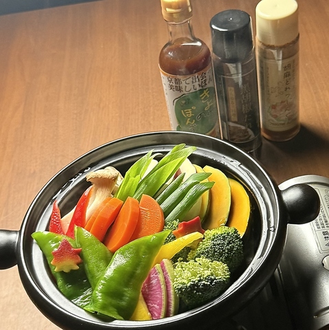 その日一番の野菜を土鍋で蒸します!素材の旨み、甘み、香りが存分に引き出され、日本酒の肴にも◎
