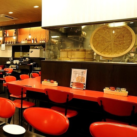 赤いチェアが映えるカウンター席は、お一人様やサク飲みにも最適。目の前で調理風景も楽しめる特等席で、安亭自慢の餃子とビールを気軽に堪能できます!