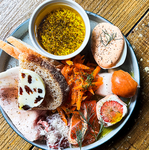 レーズンバター、クリームチーズと黒胡椒蜂蜜がけ、十勝牛のカルパッチョ、人参ラペ、サーモンマリネ、タコとアボカドのレモンマリネ、イチゴとチーズの生ハム包み、大根と梅干しのピクルス、ワインポークのロースハム。※時期により内容が異なる場合がございます。※画像は1人前。人数分のご注文をお願いします。