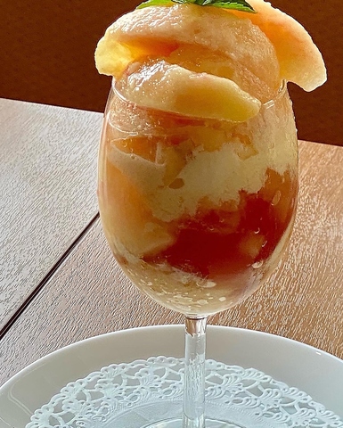 季節限定パフェのなかでも、一番人気のもも丸ごと1個使った贅沢な桃パフェ!桃大好きな店主が、どうしても作りたかったジューシーな桃のみ使った特別なパフェです。予約がおすすめ