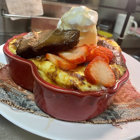甘い卵入りのクリームに漬け込んだふわ甘なバターの風味漂う熱々のフレンチトーストの上にひんやりバニラアイスと濃厚フワフワ2種の生クリームをトッピング!インスタ映え間違いなし!