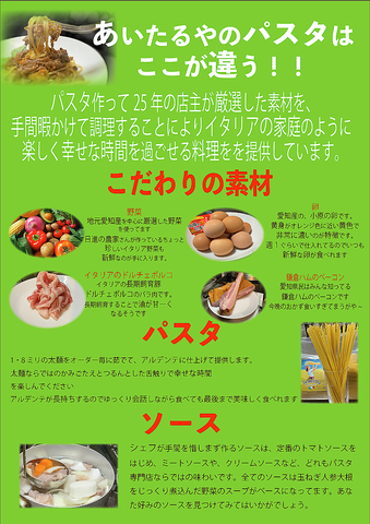 パスタ作って25年の店主が厳選した素材を、手間暇かけて調理することによりイタリアのかていのように楽しく幸せな時間を過ごせる空間を提供しています。