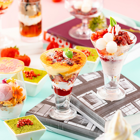苺のブリュレパフェ、春のフルーツと北海道ソフトの贅沢パフェ、ほうじ茶と生チョコのパフェ、いちご白玉あんみつパフェの4種類のパフェに加え、季節のパフェや抹茶と苺のティラミス、苺の求肥大福、温かいおしるこもお好きなだけどうぞ。(パフェはハーフサイズもご用意しています。)