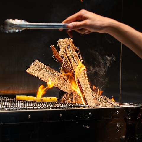薪火で香ばしく焼き上げた上質なお肉や新鮮野菜をお召し上がりいただけます。心地良い空間で特別な食事を。