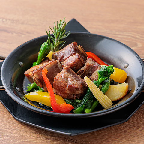 醤油・みりん・酒など和の調味料に一晩漬け込んだスペアリブを柔らかくなるまで煮込み、最後にオーブンで表面をカリっと焼きあげます。骨からホロリと離れる肉はあえて和風の味にしたことでご飯にもパンにもよく合います。