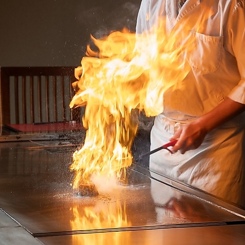 鉄板焼コーナーでは、厳選された和牛を焼き職人が目の前で調理し、焼きたてをいただける。