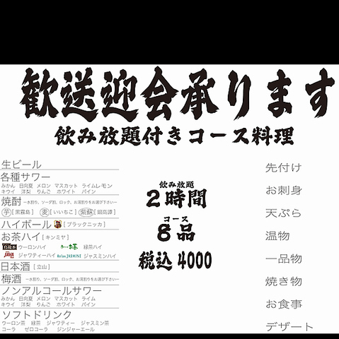 生ビールやソフトドリンクはもちろん、日本酒・ワイン・焼酎や特別サワーなど多数ご用意!
