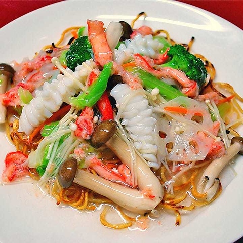 女性からも特に人気を集める、海鮮の風味豊かな【アオリイカと紅ずわいがに入りあんかけやきそば】!ぷりぷりのアオリイカと、風味豊かな紅ずわい蟹がたっぷり入った豪華な仕上がり★あっさりとした絶妙な塩味の餡が、カリッと香ばしく焼かれた麺に絡みつく瞬間がたまりません!シャキシャキとしたゴロゴロ野菜の食感も楽しく、食べ応えも抜群!