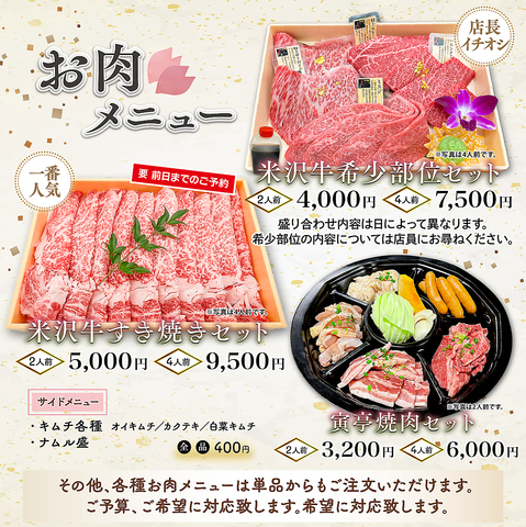米沢牛ステーキ・厚切り牛タン・キムチ・ナムル3種・本日の揚げ物・本日の煮物・焼豚・玉子焼き