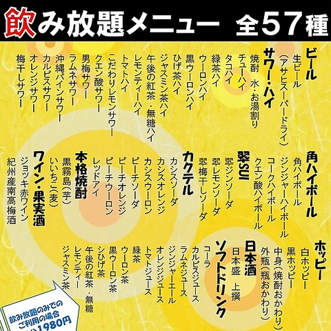 飲み放題メニュー全57種 ※完全飲み切りグラス交換制※中身がかなり残っている状態での追加注文、グラス返却、または一人で複数注文するなどされた場合は、その分は単品で伝票につけさせて頂きますのでご注意ください