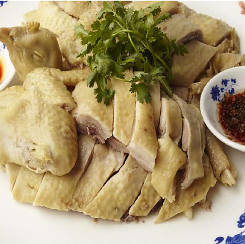 ※1/4羽:2970円(税込)、1/2羽5060円(税込)。特製の塩ダレ(ウコン、四川山椒等)で香り高く茹で上げた逸品。中国では薬用鶏として知られる烏骨鶏との交配で生まれた「おおいた冠地どり」。柔らかくジューシーで旨味たっぷりの地鶏です。