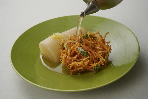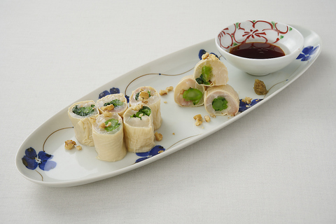 脂ののった八十八鯛と菜の花を生湯ゆばで巻き、生春巻き風に仕上げました。
