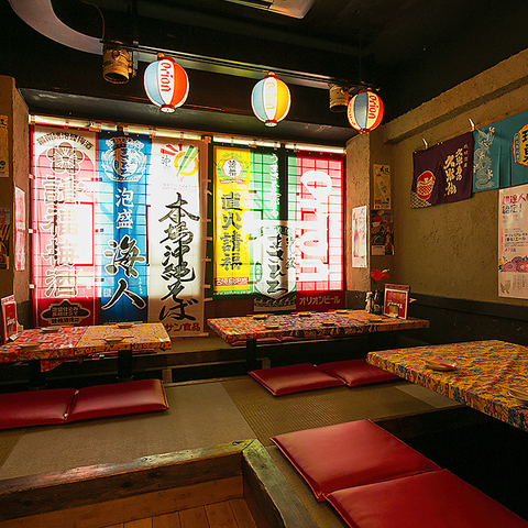 【沖縄気分を満喫】シーサーが描かれた灯篭や泡盛の暖簾・オリオンビールの提灯など、まるで沖縄を思わせるかのようなリラックス空間が広がっております。カウンター席もございますので、仕事終わりの一人飲みやデートなど落ち着いてお酒を飲みたい時にオススメ☆沖縄気分を感じながら自慢の料理をお召し上がりください☆
