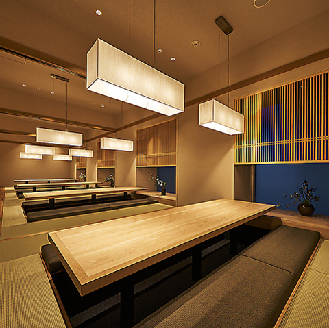 2名様から40名様まで利用できる数奇屋風の落ち着いた個室が揃い、ご両家のお顔合わせや長寿のお祝い、ビジネスの接待や 宴会など、様々なシーンで活躍します。掘り炬燵和室やテーブル個室から選べるので、ニーズに合わせてご利用可能。和服姿の接客によるおもてなしで、特別なひとときをお楽しみください。
