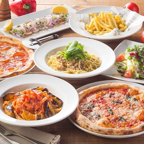 ピザ・パスタ全21種が食べ放題。前菜3種盛り合わせ、サラダ、ソフトドリンク飲み放題付き!