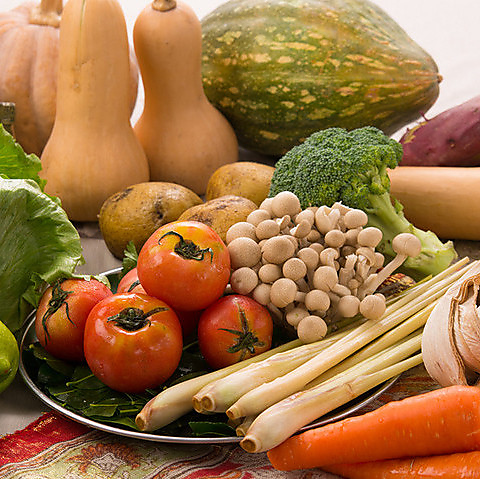 ・お米は山口県吉敷郡の原田さんが作る万田酵素栽培米を使用・小豆玄米ごはんを高圧力鍋で毎日炊き上げ・アジア野菜は福岡の川辺農園より、他のお野菜もなるべく地元産を使用・自家製のハーブをはじめ、デトックス効果の高いハーブを多く使用
