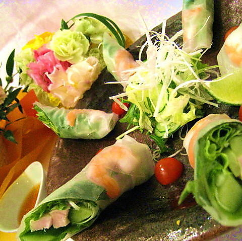 七福神にちなんで、7種類の具材を巻き込んだ縁起物。特性チリソースをつけて”願いを込めて”いただきます。