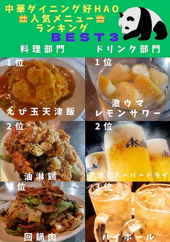 | カウンター | あり :6席!創作中華ダイニング 好 (HAO)はカウンター席があります。少人数でもお気軽にご来店ください。 |