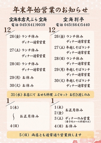 本年も当店をご利用いただきありがとうございました。年始は1月5日より通常営業となります。