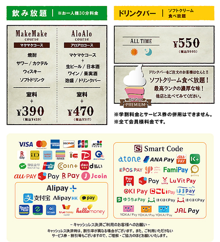 | 個室 | 22名様×2 | 2次会や打上げ、パーティーなどの大人数ももちろん大丈夫です。多彩なおいしいお料理と100種類ほどの豊富なドリンク、そして大人気のソフトクリーム食べ放題など、人数に関わらずお楽しみ頂けます☆ |