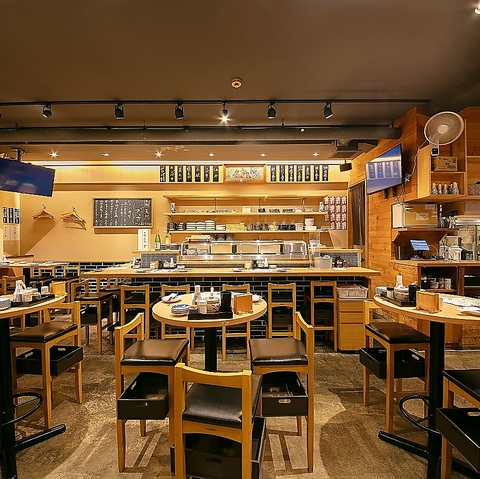 木の温もりを感じる明るい店内。寿司カウンターを中心に、テーブル席まで活気と落ち着きが調和する空間で、仲間との宴席からお一人様まで賑やかに心地よく過ごせます。