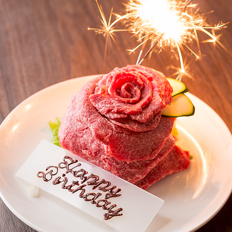 誕生日や記念日など、大切な方のお祝い事には肉をバラに見立てて盛り立てた肉ケーキにメッセージを添えてサプライズ♪きっと良い記念日になる事間違いなし!お祝いを楽しんだ後は主役から順番に焼いて召し上がっちゃってください!!歓送迎会にもぴったりです!