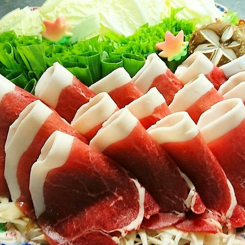 天然特選牡丹肉使用。前菜・造里・御凌・鍋・〆・甘味のぜん6品。猪肉は、牛肉や豚肉と比べて高タンパク・低カロリー・低脂肪でカルシウムやタウリン・ビタミンB1やコラーゲンも豊富に含まれるヘルシーな食材です。新陳代謝やエネルギー代謝・免疫反応などに効果的