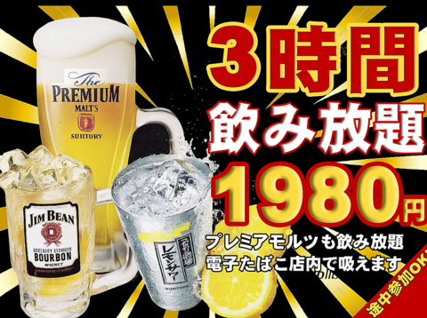 食べ放題コースを豊富にご用意しており、大人気のコースです!+1,000円で飲み放題をお付けすることも可能で、+1500円でビール付きのプレミアム飲み放題に変更も可能です!