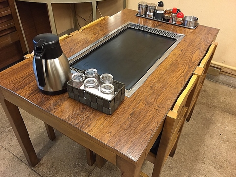 テーブルに設置された大きな鉄板。自分で作る楽しさも味わえるお店なんです♪