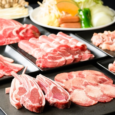羊肉3種/牛肉/豚肉/鶏肉の食べ放題 【食べ放題内容】ラムジンギスカン、ラムロール、マトンロール、牛カルビ、豚カルビ、鶏もも、ソーセージ、焼き野菜盛り合わせ、きのこ盛り合わせ、ごはん
