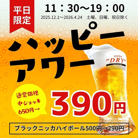 アサヒビール北海道工場製造スーパードライ中ジョッキ650円→390円,平日限定,11:30~19:00,クーポン提示で