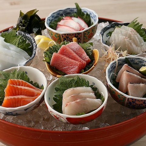 仙台市場より届いた取れたての旬の鮮魚を厳選して盛り合わせに!こだわりの三種の醤油でどうぞ!!お刺身は飲み放題付きの宴会コースでもお楽しみ頂けます!ぜひ各種宴会にご利用下さいませ。