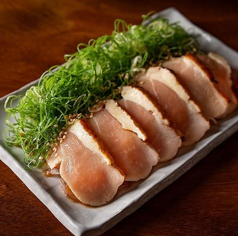 表面だけ香ばしく炙った地鶏のむね肉を使用。地鶏むね肉のもっちり感が味わえます。----------・当社の冷製地鶏料理は『塩せき熟成ハム製法』により、非加熱食肉製品の規格基準をクリアした製品を使用しています。 「地鶏レバ刺し」は、厚生労働省が定めた製法(中心温度が63度、30分加熱)を施した『加熱食肉製品』を使用しています。念のため抵抗力にご不安のある方はお控えください。"
