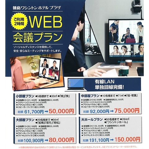 WEB会議のご案内:フレッツ光隼を宴会場単独回線で敷設しました。有線LAN、WIFI対応可。WEB会議はもちろん、セミナーや講演会、株主総会等もWEB配信が可能です。会場費、周辺機器がセットになったお得なプランをご用意致しました。「小部屋プラン」(5名様)50,000円~ご用意しております。