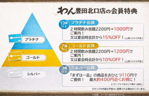 「わん豊田北口店」の会員特典は来店回数でランクアップします 。13回以上のプラチナなら飲み放題が1,000円、または宴会15%OFF(上限3,000円)とお得です 。7回以上のゴールドは飲み放題1,200円、3回以上のシルバーは一品料理が110円で提供されます 。他券との併用は不可です 。