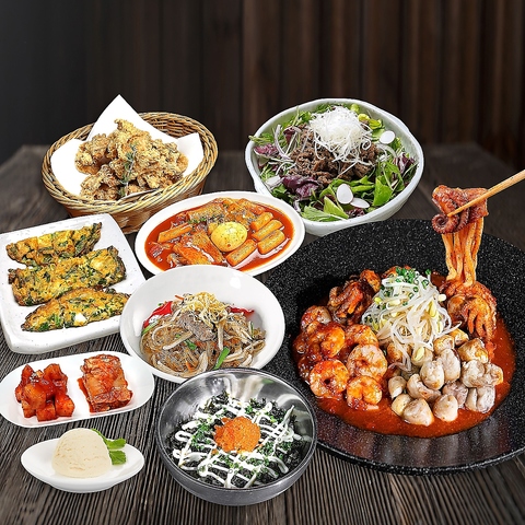 旨辛なタコのチュクミを主役に、韓国前菜や〆の鉄板焼きごはんまで楽しめる贅沢コース!新鮮な野菜とぷりぷりのチュクミを甘辛特製ダレで絡め、ビールがすすむ一品に。トッポギやチヂミ、サンチュなど人気の副菜も勢揃い。飲み放題はゆったり2.5時間、仲間と語らう宴にぴったりの韓国満喫コースです。