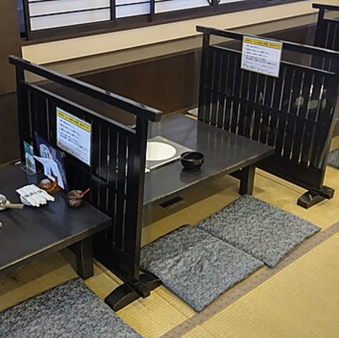 【座敷:4名様×19卓】全席座敷で、隣の席とは仕切りがあります。※お子様ずれのネット予約の際は、“お店へのご要望”にお子様の数を入力していただけましたら幸いです。また、座椅子とお子さまチェアーもご用意できますのでお気軽にお声掛けください。