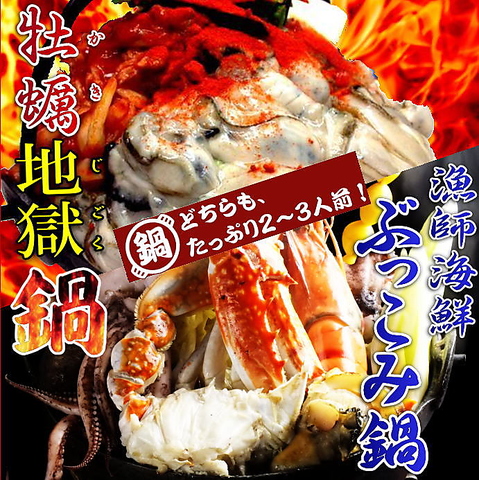 漁師海鮮ぶっこみ鍋と牡蠣の地獄鍋始めました。海鮮ぶっこみ鍋は赤海老、イイダコ、渡りガニ、ホタテ、あさり、牡蠣、イカゲソ、鱈、海鮮つくね、白菜、人参、長葱、椎茸、もやし、銀杏串、厚揚げなどを豪快にぶっこみました。※鍋のラストオーダーは通常のラストオーダーの1時間前になります。