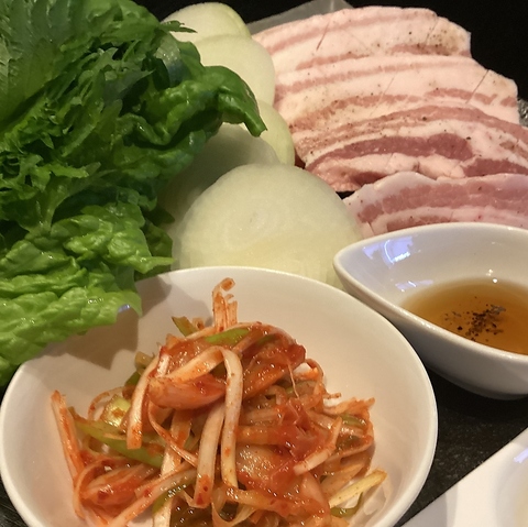 厚切りの豚バラ肉を専用の鉄板で余分な脂を落としながら焼きあげ、キムチ、ネギ、ニンニク、と一緒にサンチュにくるんで召し上がれ。