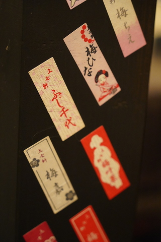 京都最古の花街;上七軒との深い繋がりを示す「千社札」や「団扇」が多数飾っております。現役の舞妓さんの団扇も!これだけの団扇や千社札を見れるのはまるいちだけ。