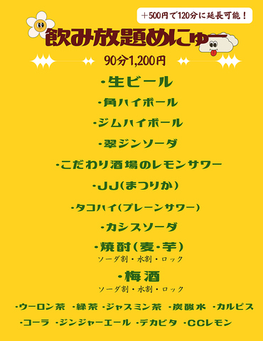 - +500円で、飲み放題時間120分に変更可能!※当日でも受付可能になりますので、お気軽にスタッフまでお申しつけください!