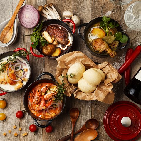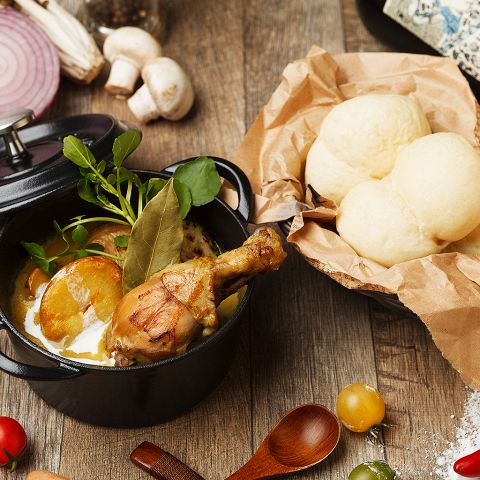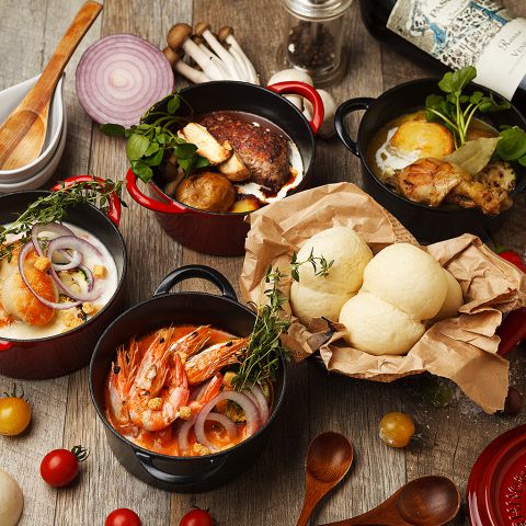 当店名物「4種のつけパンシチュー」「肉料理」をワンランク上のリゾート空間で召し上がれ★ゆったり宴会にオススメ!当店名物料理を含む 3時間飲み放題付きコースは3500円~ご用意しています♪
