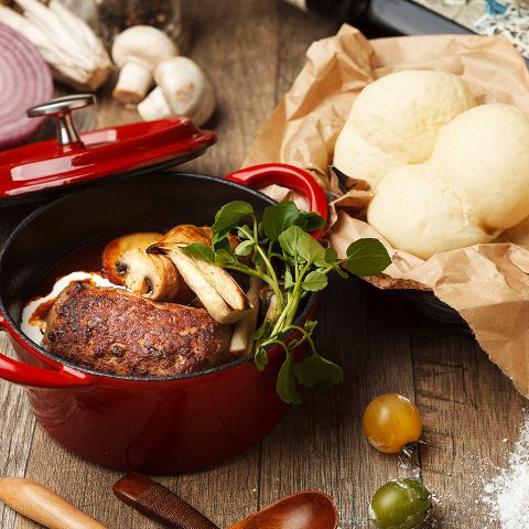 肉々しい粗挽きハンバーグを自家製のデミグラスソースで煮込んだ当店1番人気のつけパンシチューです♪