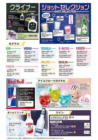 | お酒 | カクテル充実、焼酎充実、日本酒充実、ワイン充実 |