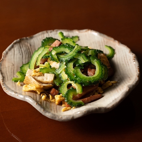 沖縄料理といえば、ゴーヤーチャンプルー♪ゴーヤの鮮やかな緑が香ばしく焼けていく。ほろ苦さが特徴のゴーヤは、豚肉の旨味と絡み合い、絶妙なバランスを生み出します。